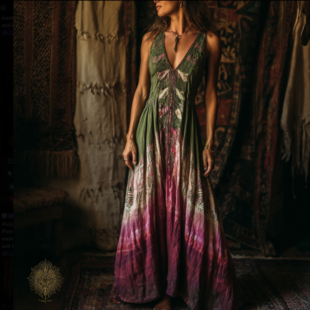 Bohemian Style Plant-dyed Knitted Flower-hollowed Sleeveless V-neck Long Dress