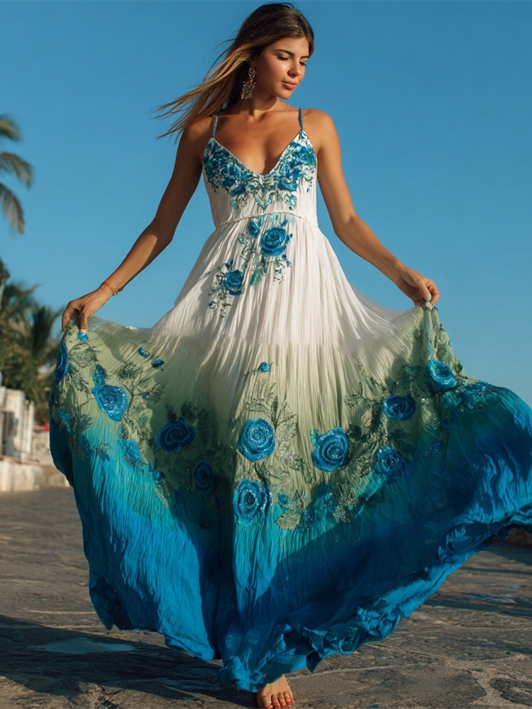 Boho Floral Embroidery Gradient Women's Spaghetti Strap Maxi Dress