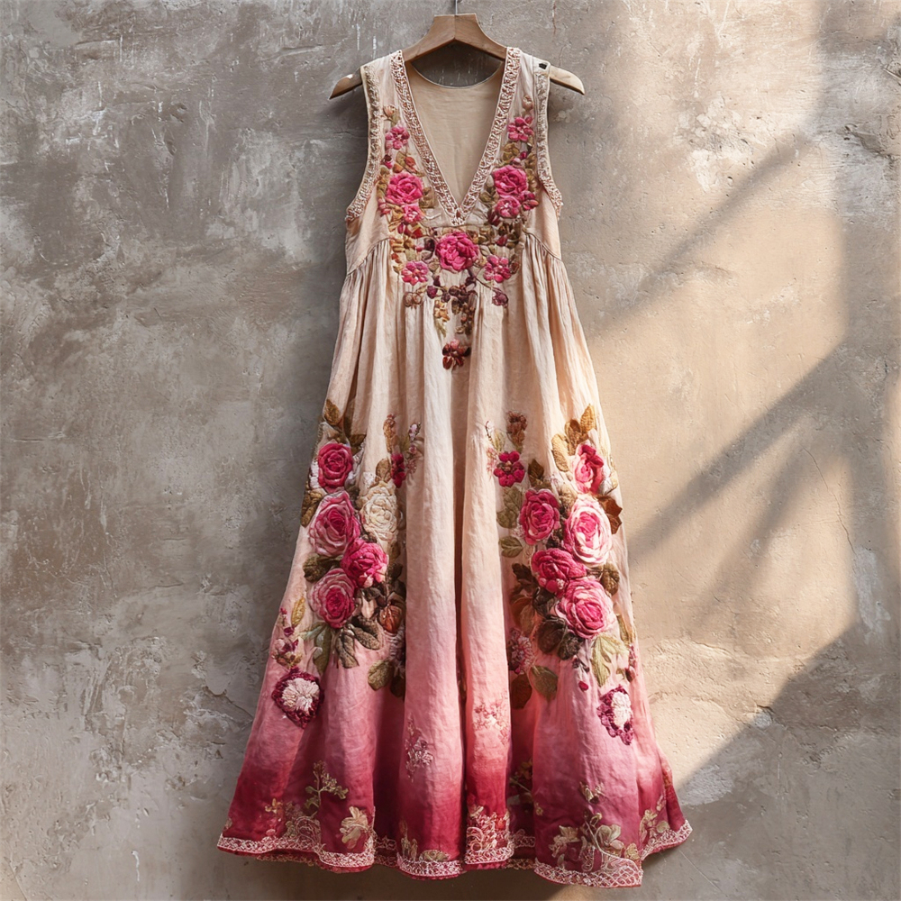 Boho Romantic Floral Embroidery Women's Linen V-neck Vest Maxi Dress
