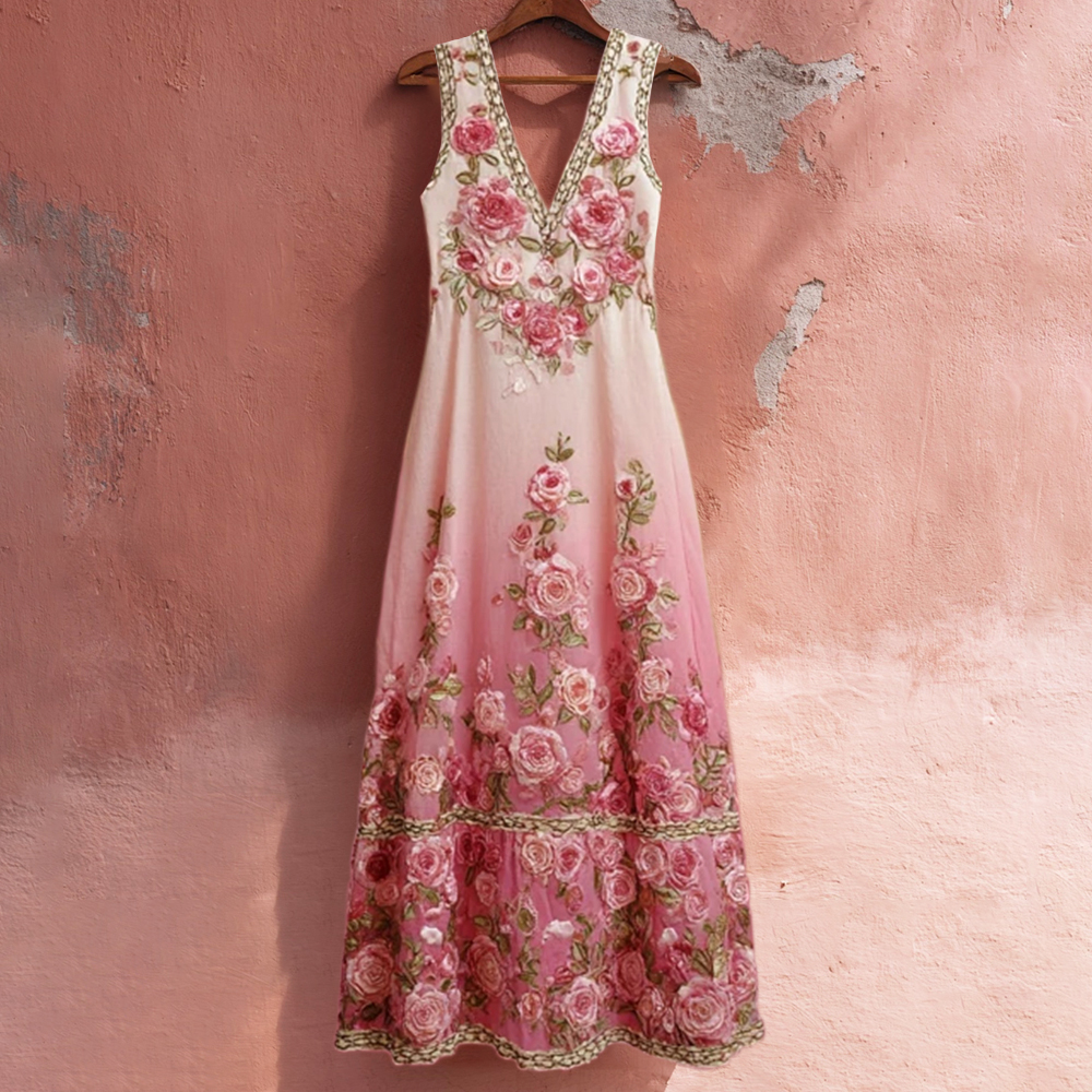 Boho Romantic Rose Embroidery Women's V-neck Vest Maxi Dress