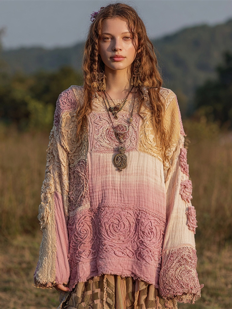 Celtic Knot Art Boho Floral Embroidery Women's Linen Loose Top