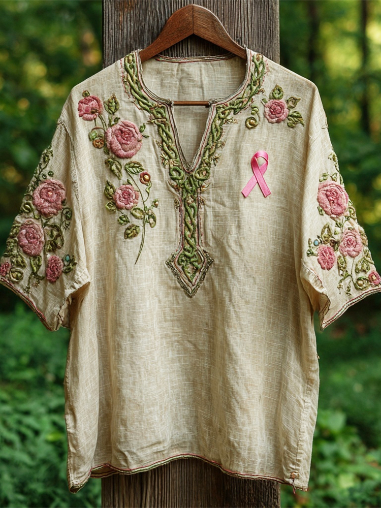 Celtic Knot Rose Embroidered Pink Ribbon Awareness Vintage Women's Linen V-neck Shirt