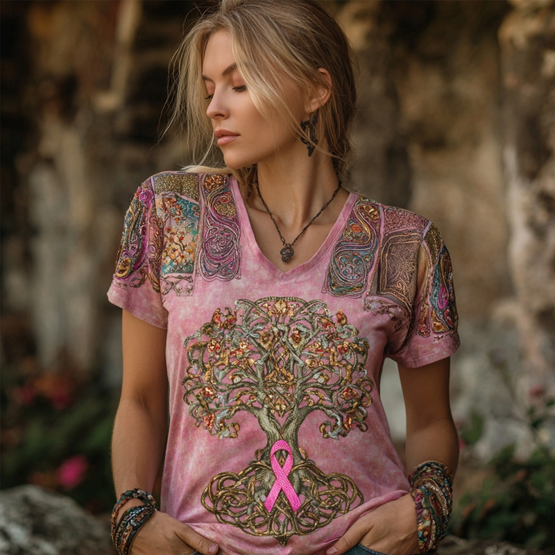 Celtic Tree Of Life & Pink Ribbon Embroidered Retro T Shirt