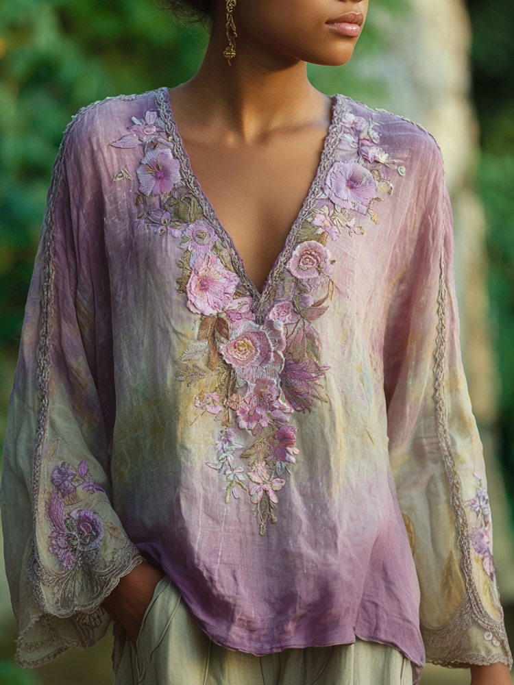 Classy Flowers Embroidered Light Purple Gradient Linen Shirt