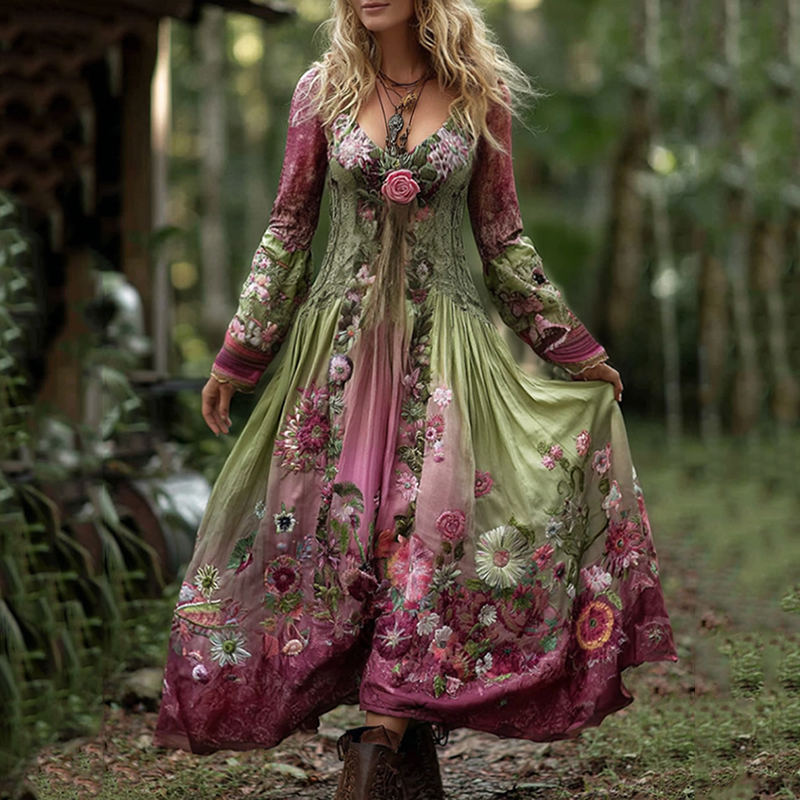 Classy Gradient Pink Roses Cancer Awareness Embroidered Linen Maxi Dress