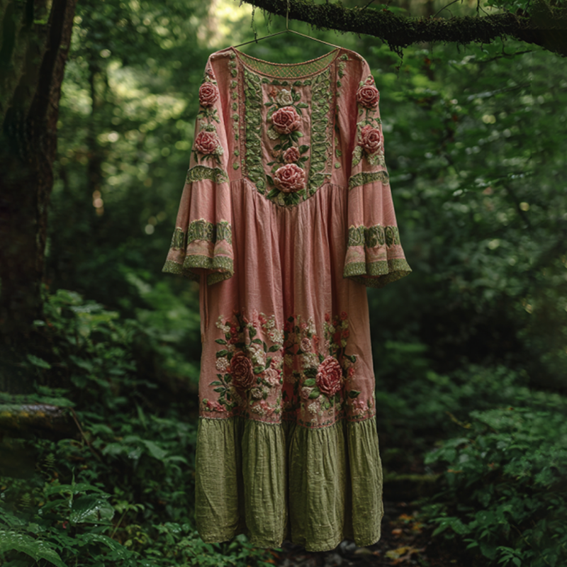 Classy Gradient Pink Roses Cancer Awareness Embroidered Round Neck Linen Maxi Dress