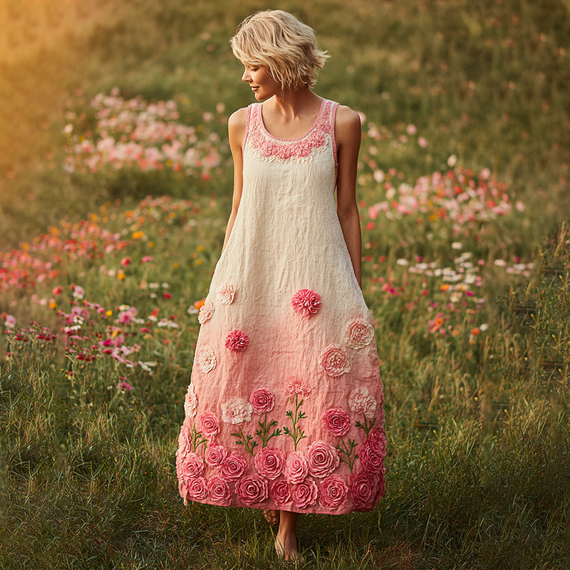 Cozy Pink Floral Embroidered Gradient Linen Tank Maxi Dress
