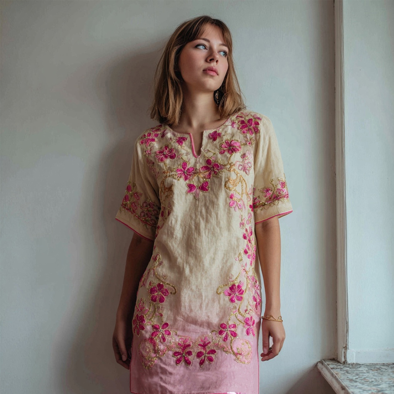 Elegant Pink Flowers Embroidered Gradient Linen Midi Dress