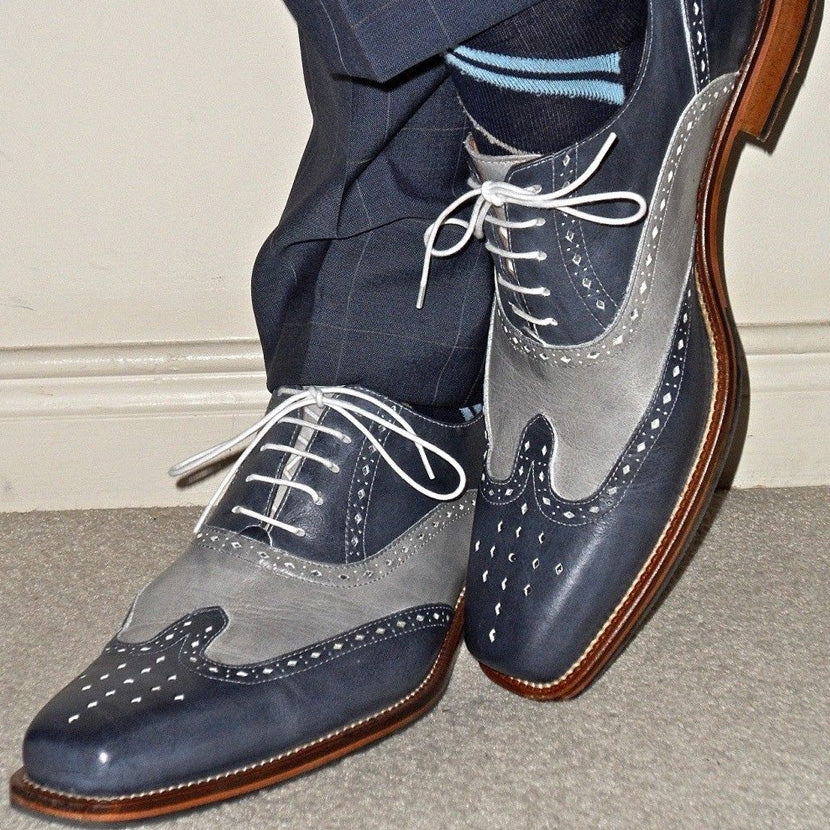 Men Two Tone Wing Tip Brogue Formal Shoes Blue And Gray Dress Shoes