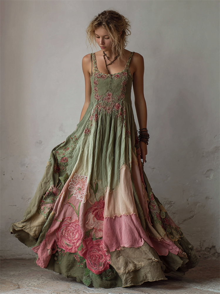 Pink Floral Embroidered Gradient Fiber Art Flowy Linen Maxi Dress