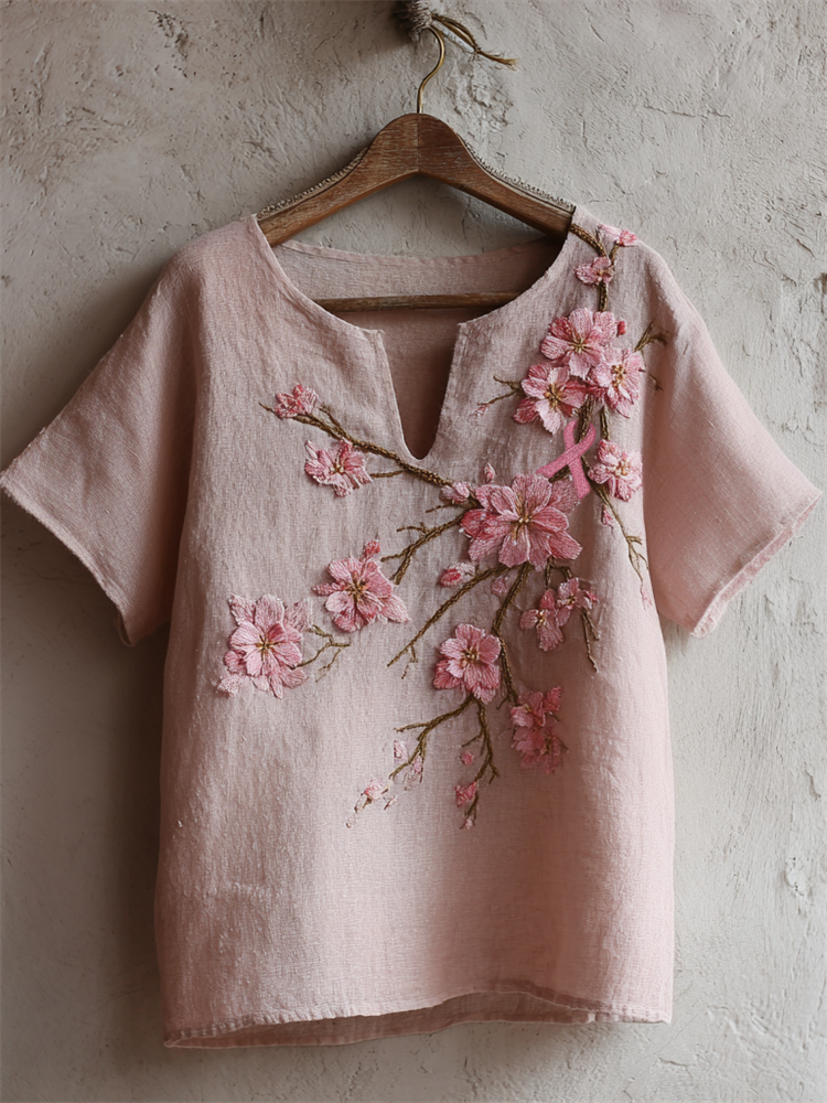 Pink Ribbon Japanese Cherry Blossom Embroidered Linen Tunic
