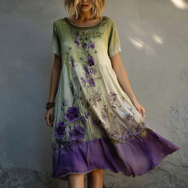 Purple Floral Embroidered Gradient Flowy Linen Midi Dress