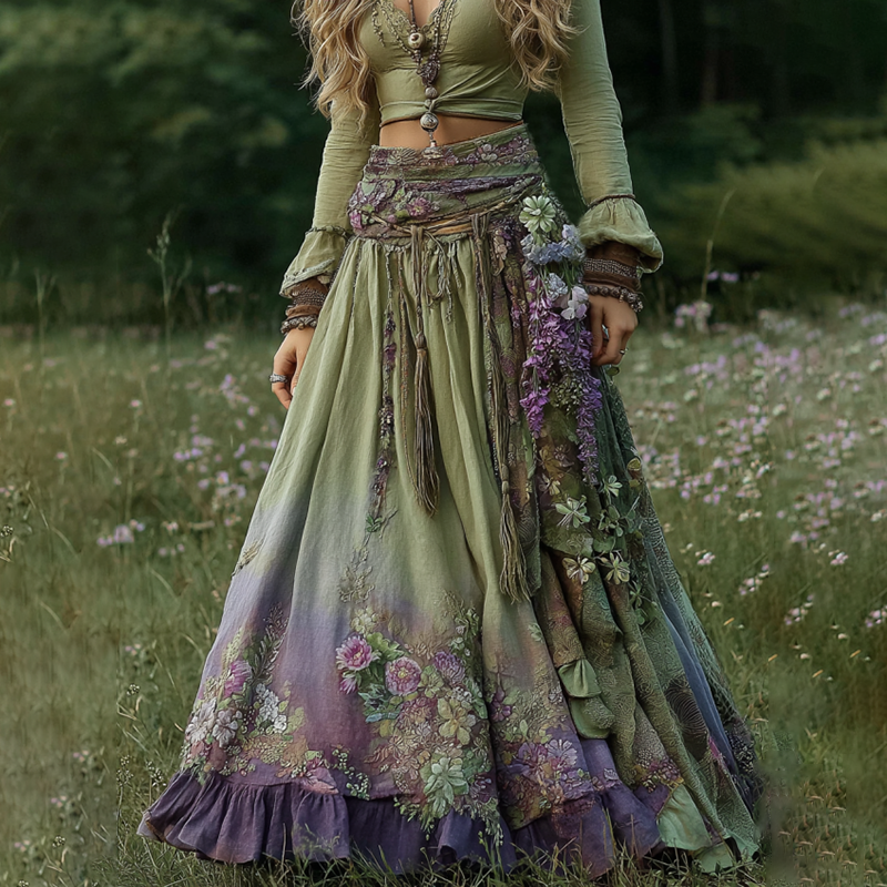 Vintage Boho Purple Floral Patchwork Art Flowy Casual Linen Skirt
