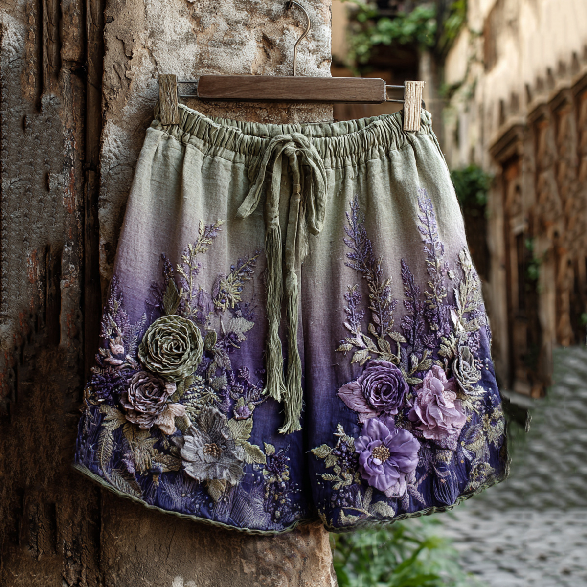 Vintage Classy Gradient Purple Lavender And Floral Embroidered Linen Shorts