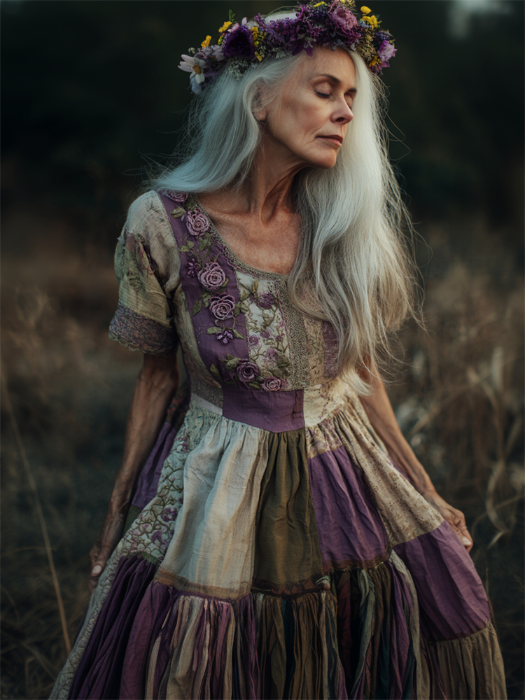 Vintage Cottagecore Purple Roses Floral Patchwork Linen Dress