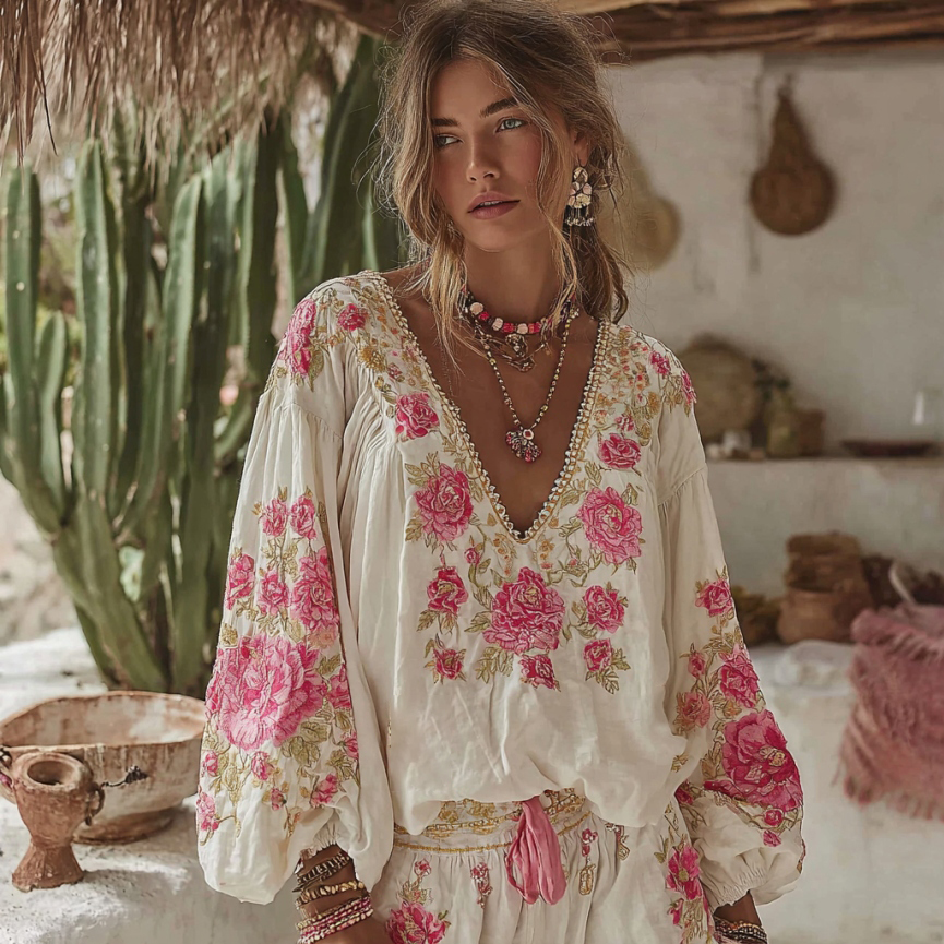 Vintage Floral Art Embroidery Linen V-neck Long Sleeves T-shirt