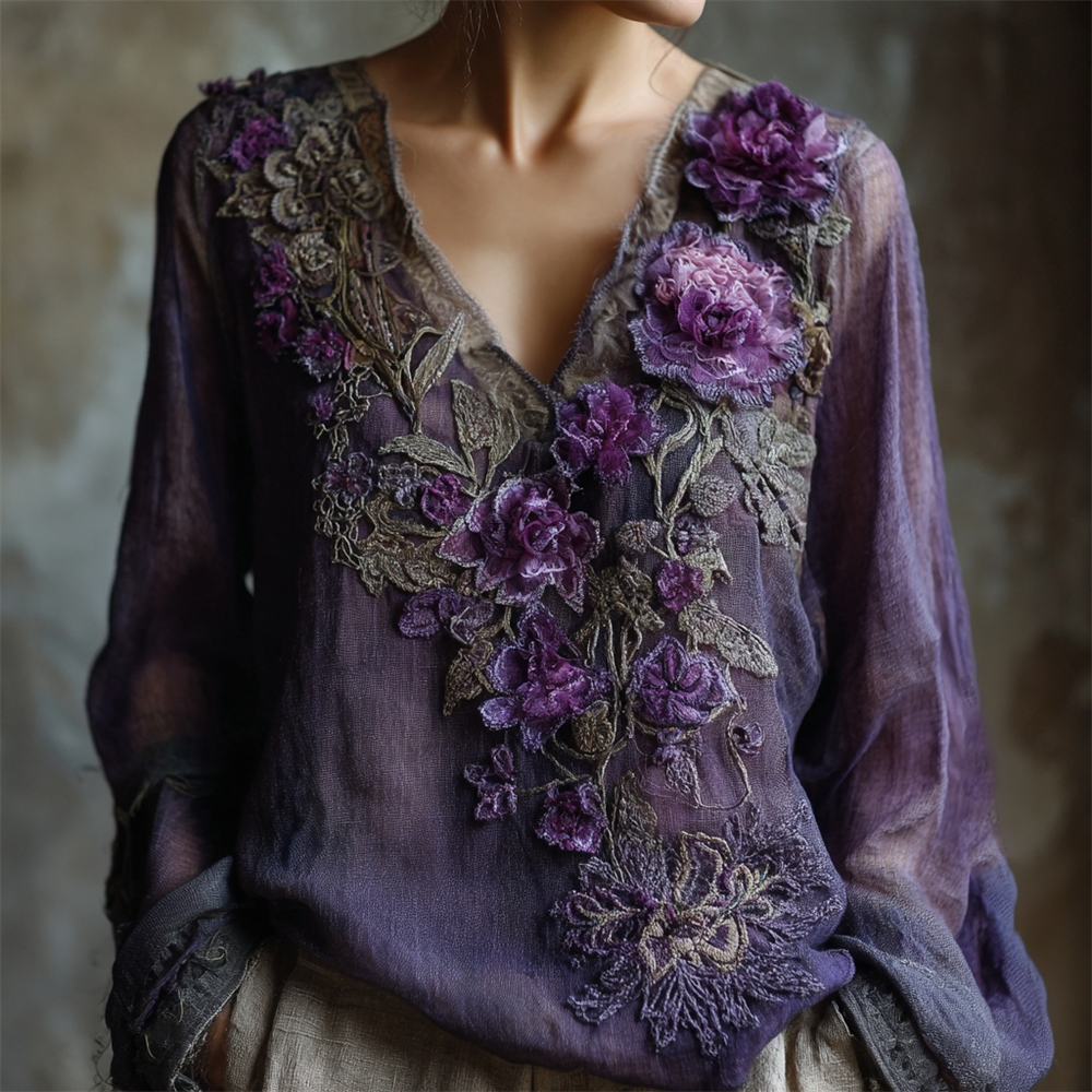Vintage Gauze Floral Embroidery Women's V-neck Linen Long Sleeve Shirt