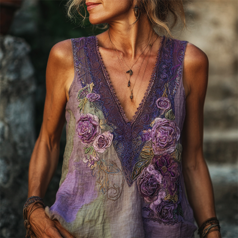 Vintage Glitter Purple Roses Embroidered Linen Tank Top