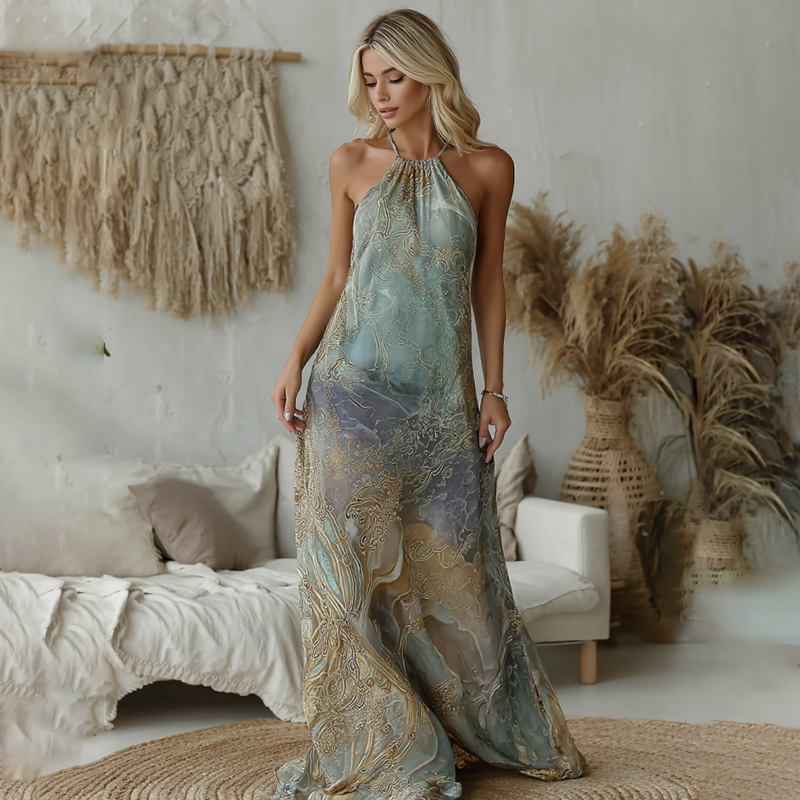 Vintage Marble Texture Collection Retro Bohemia Women Style Gradient Gilded Pattern Linen Halter Neck Long Dress