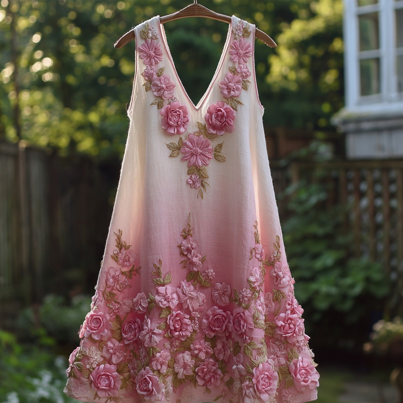 Vintage Pink Floral Embroidered Gradient Linen Mini Dress