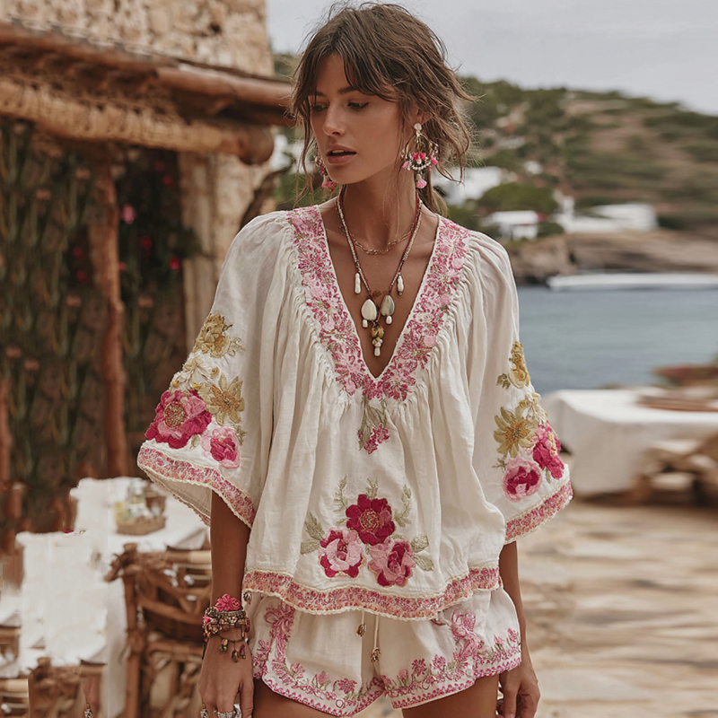 Vintage Pink Roses Embroidery Art Linen Casual Tunic
