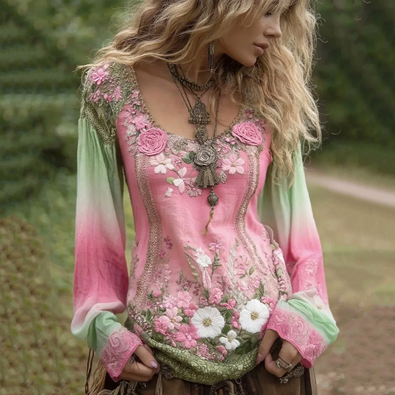 Vintage Purple Lavender And Floral Embroidered Linen Long Sleeve Shirt