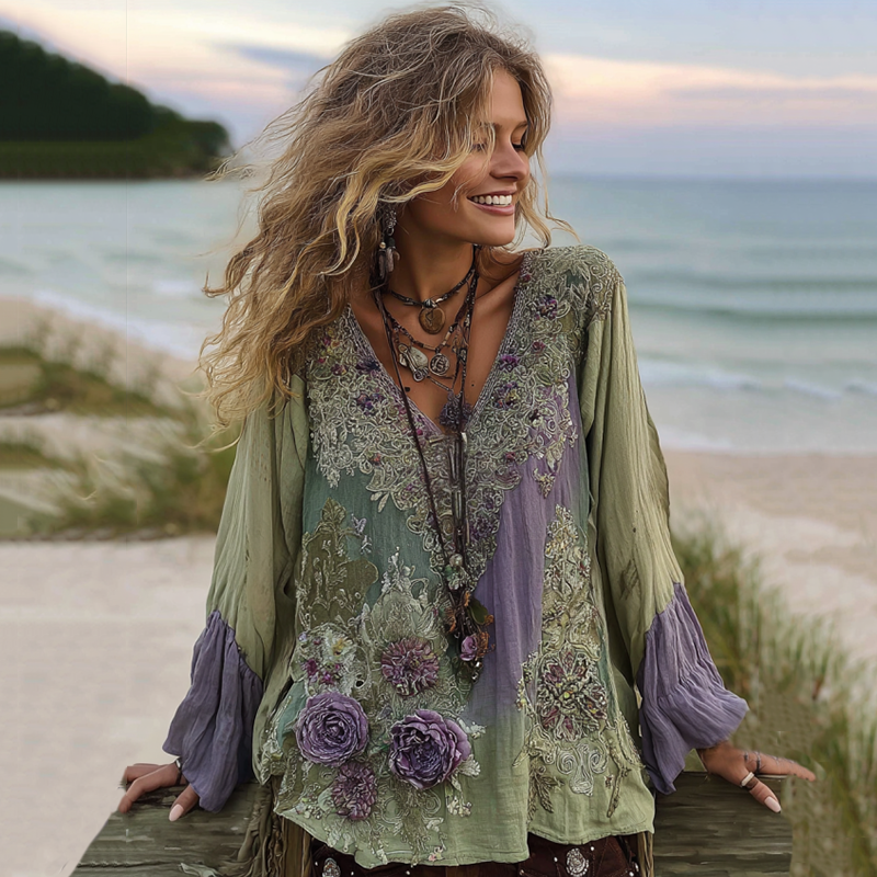 Vintage Purple Lavender And Floral Embroidered Linen V Neck Long Sleeve Shirt