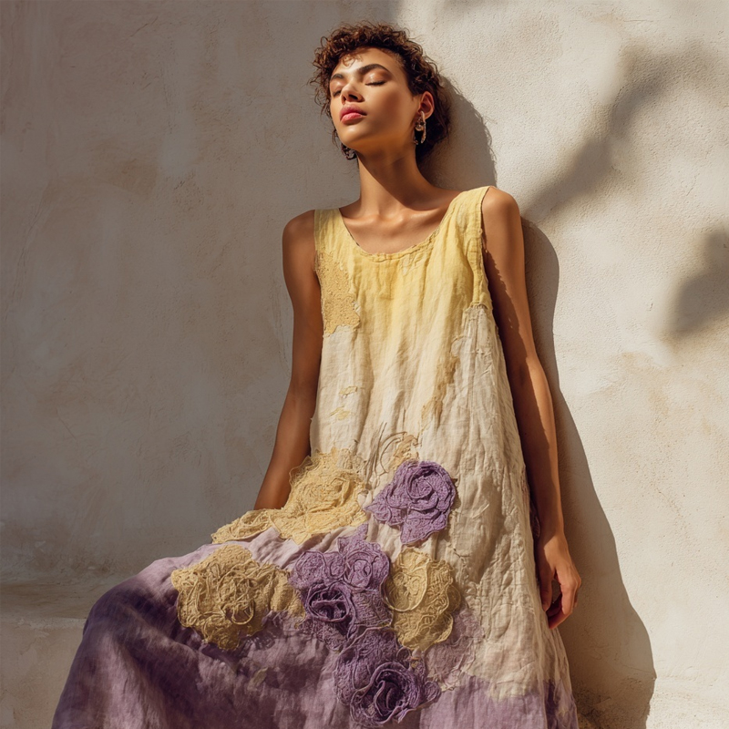 Vintage Purple Roses Embroidered Gradient Linen Midi Dress
