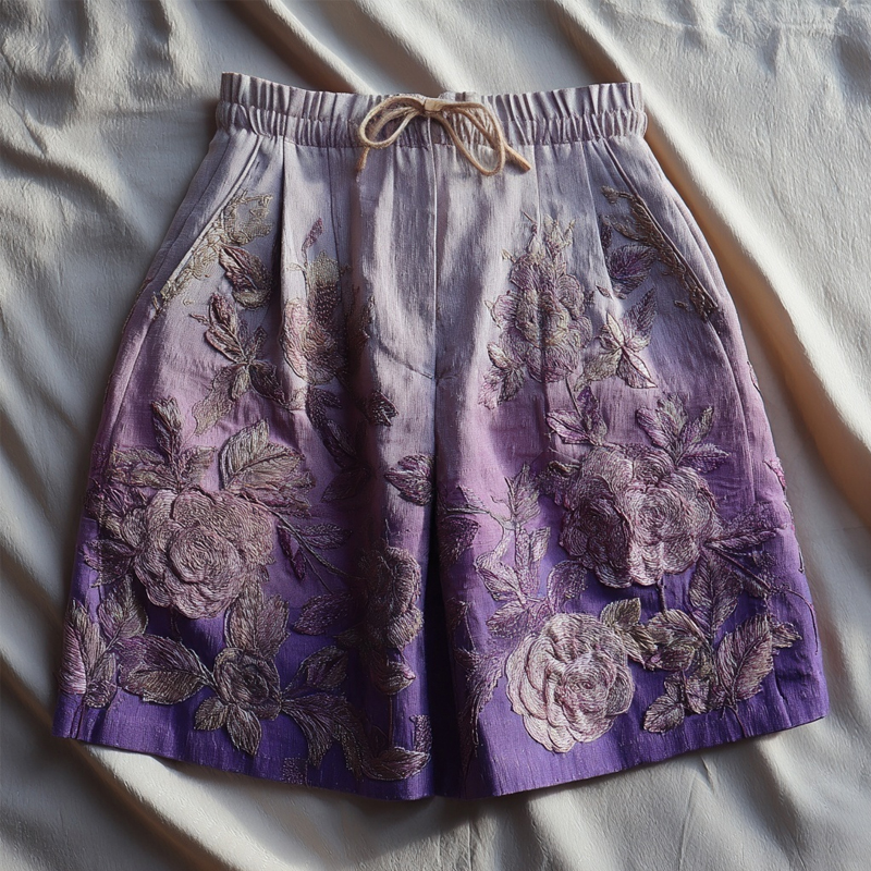 Vintage Purple Roses Embroidered Gradient Linen Shorts
