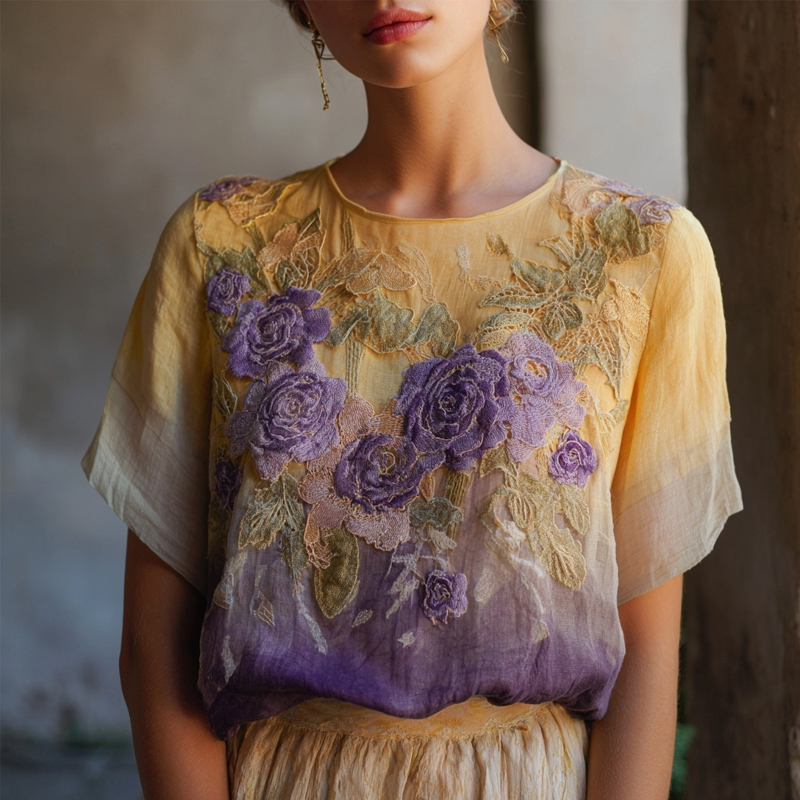Vintage Purple Roses Embroidered Gradient Linen T Shirt
