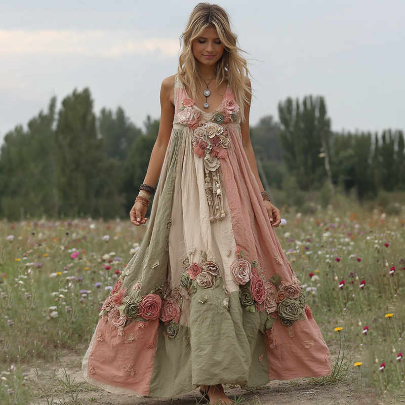 Women Vintage Floral Art V Neck Linen Maxi Dress