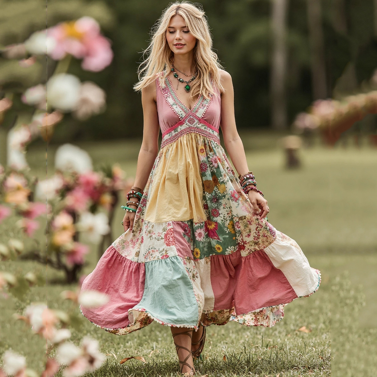 Women Vintage Pink Floral Patch Art V Neck Linen Maxi Dress