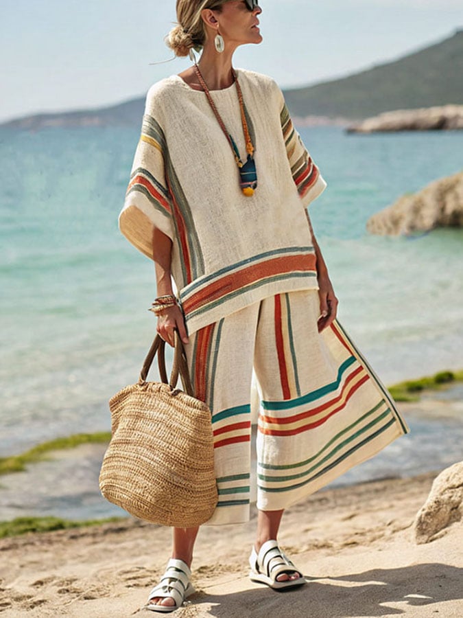 Women's Casual Round Neck Striped Printed Trousers Two-Piece Set