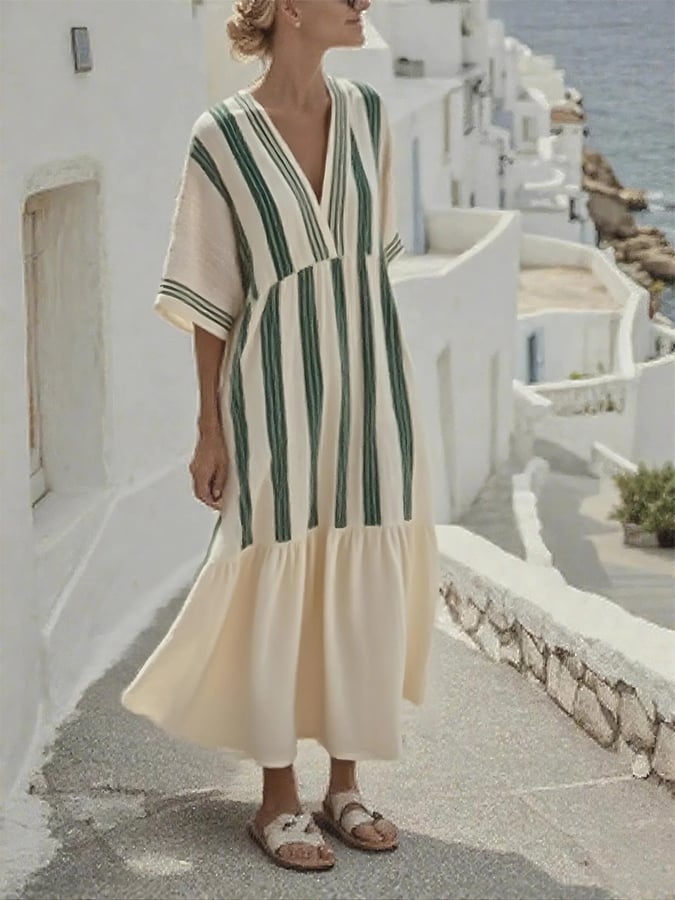 Women's Cotton&Linen Striped Pleated Dress