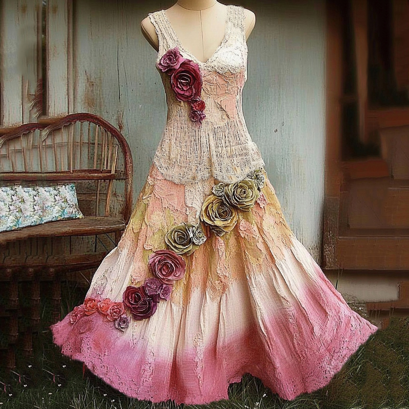 Women's Floral Embroidered Lace Patchwork Comfortable Linen Midi Dress