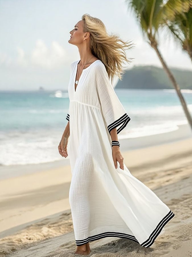 Women's Holiday Stripe Print V-Neck Cotton and Linen Dress