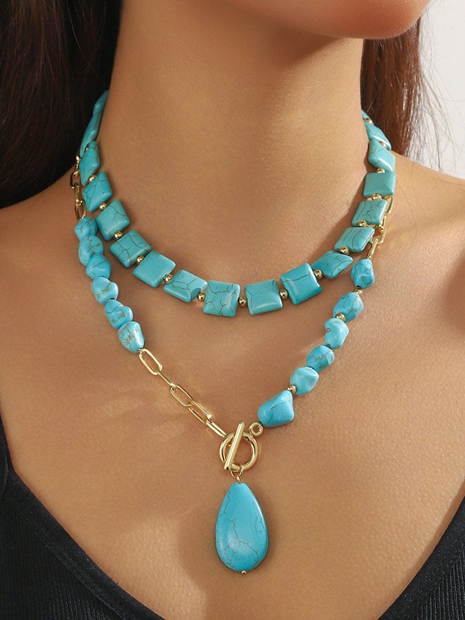 Women's Natural Turquoise Beaded Bohemian Ethnic Style Double Layer Drop Shape Pendant Necklace