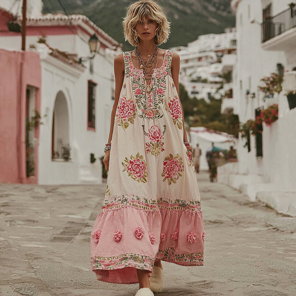 Women's Pink Rose Embroidery V-neck Loose Linen Blend Maxi Dress