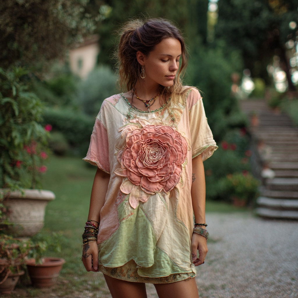 Women's Retro Floral Gradient Pattern Round Neck Short Sleeve T-shirt