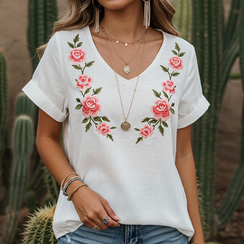 Women's Retro Pink Plant And Floral Embroidered Print T-shirt