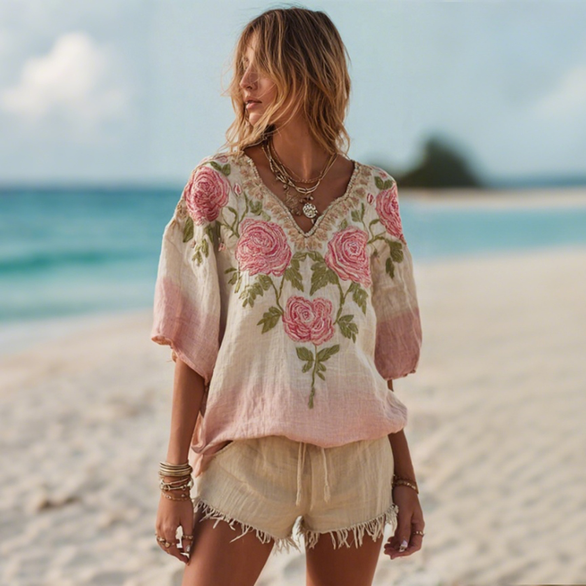 Women's Rose Floral Embroidery Art V Neck Comfy T Shirt