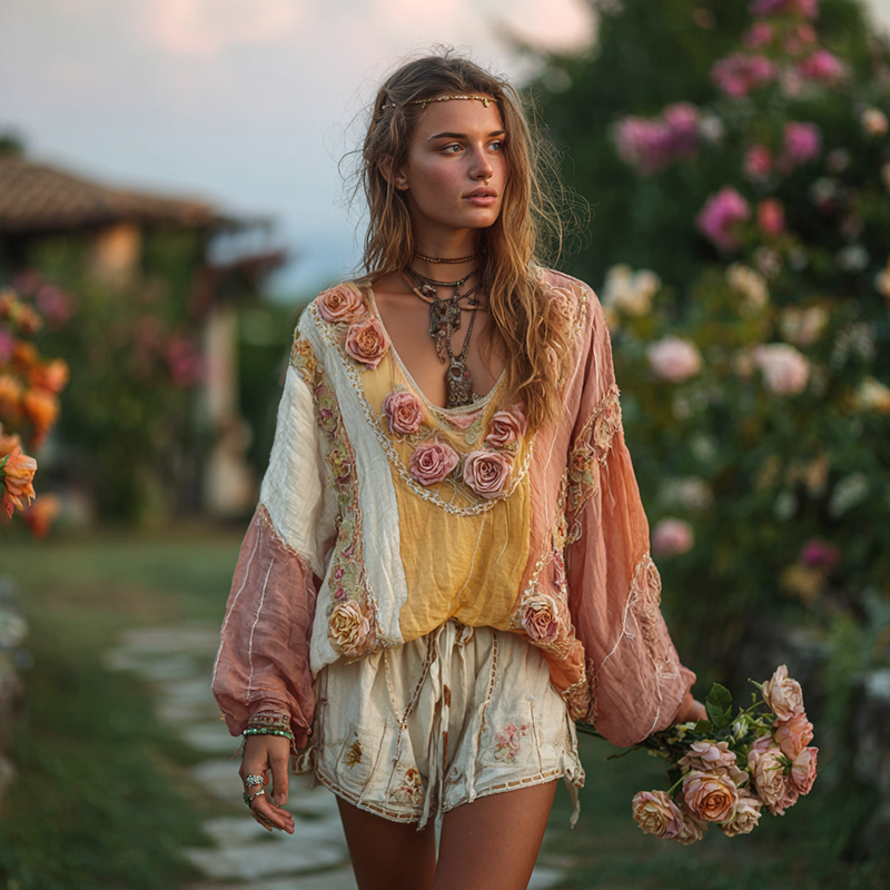 Women's Vintage Bohemian Rose Stitching V-neck Shirt