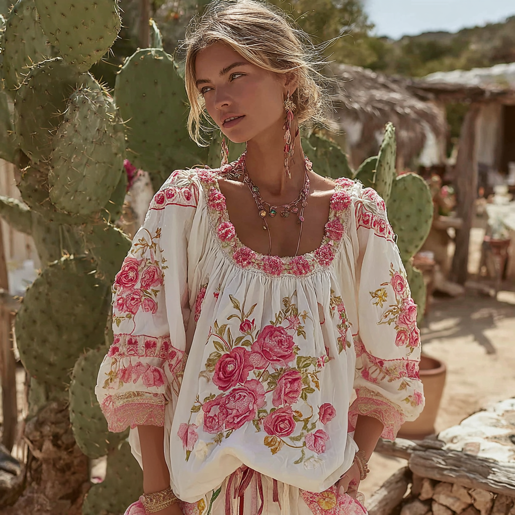 Women's Vintage Floral Embroidered Linen Crew Neck T-shirt