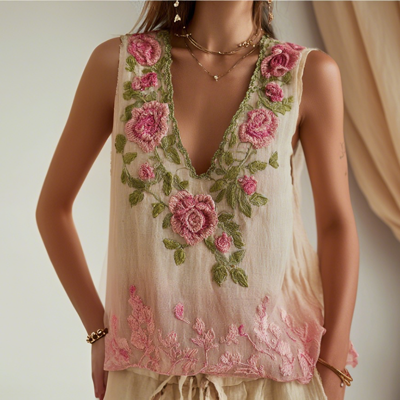 Women's Vintage Floral Embroidery Casual Sleeveless Top