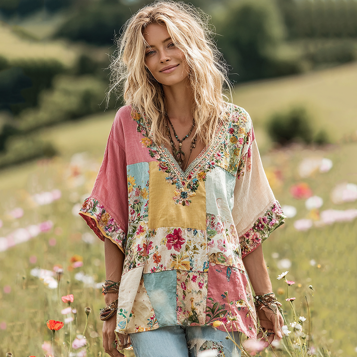 Women's Vintage Floral Geometry Art V-neck T-shirt