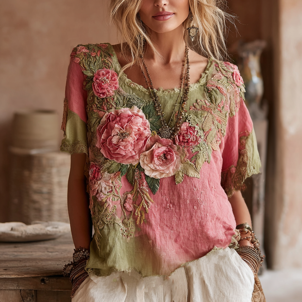 Women's Vintage Floral Pattern Gradient Crew Neck T-shirt