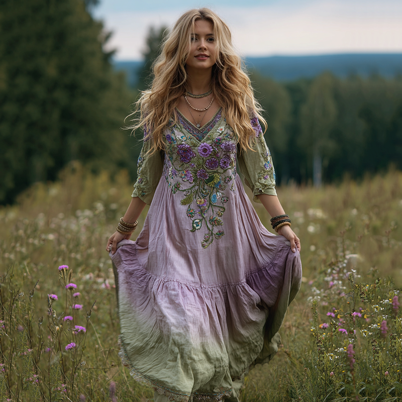 Women's Vintage Purple Floral Linen Long Sleeve Dress