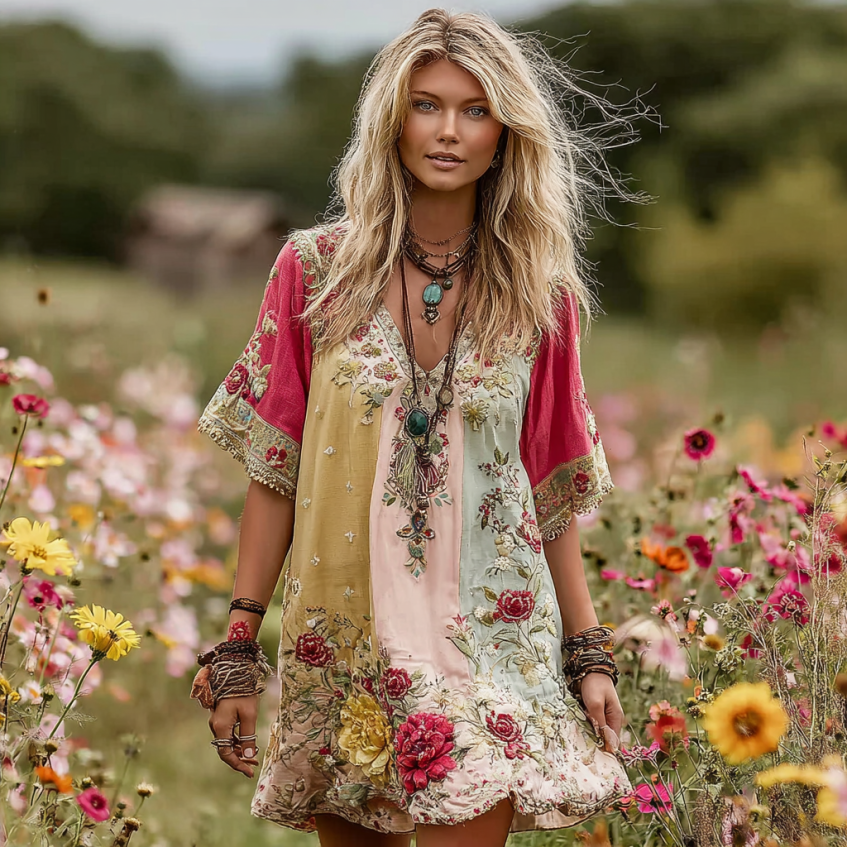 Women's Vintage Rose Floral Art Patchwork V Neck Midi Dress