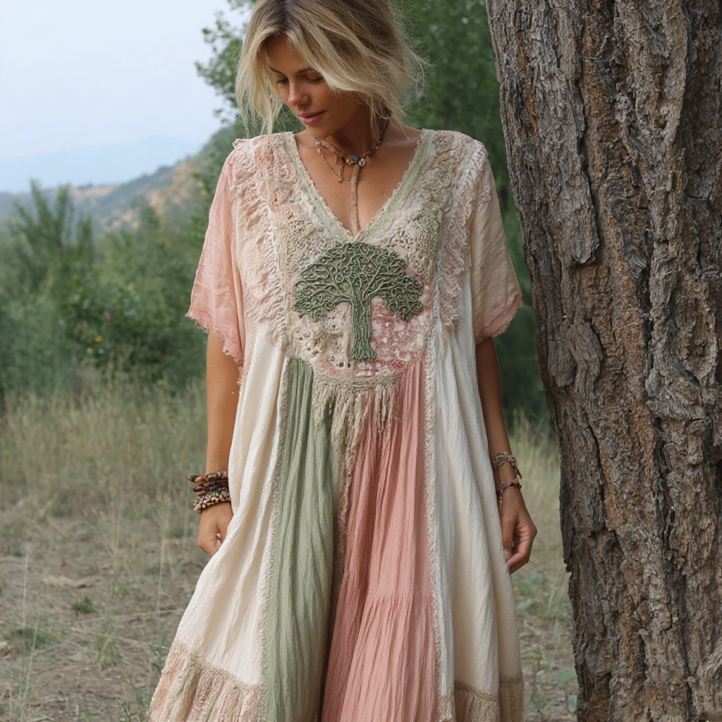 Women's Vintage Tree Of Life Patchwork Linen Dress