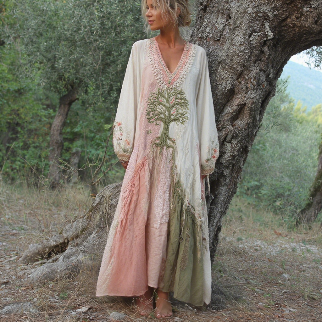 Women's Vintage Tree Of Life Patchwork Linen Long Sleeve Dress